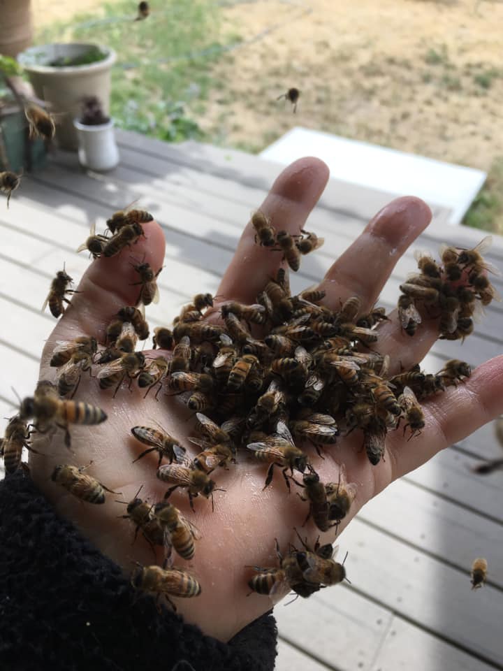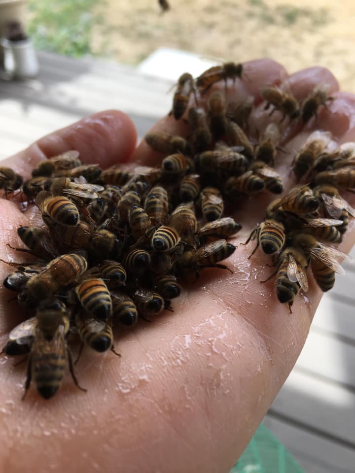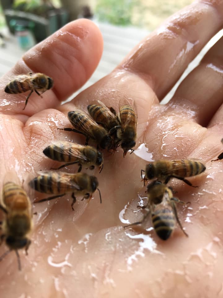 I often get asked, ” do you get stung?” Sure I do but its very rare. Instead I like to get to know them better. Know people that are afraid of bees? Thereโs really nothing to be afraid of, trust me! This time a year (fall) the nectar flow is over and forager bees are desperate to find anything, this is a good time to feed them, from the hand if you are brave enough. I mix 2:1 sugar:water and put a little into a squirt bottle and add it to my hand. As long as you donโt squish they wonโt sting, easy. Now the even funner part is that bees have a three day memory so tomorrow when you are out and about they will come find you and ask if you by chance happen to have any more? Put your hand out and watch them land and investigate!