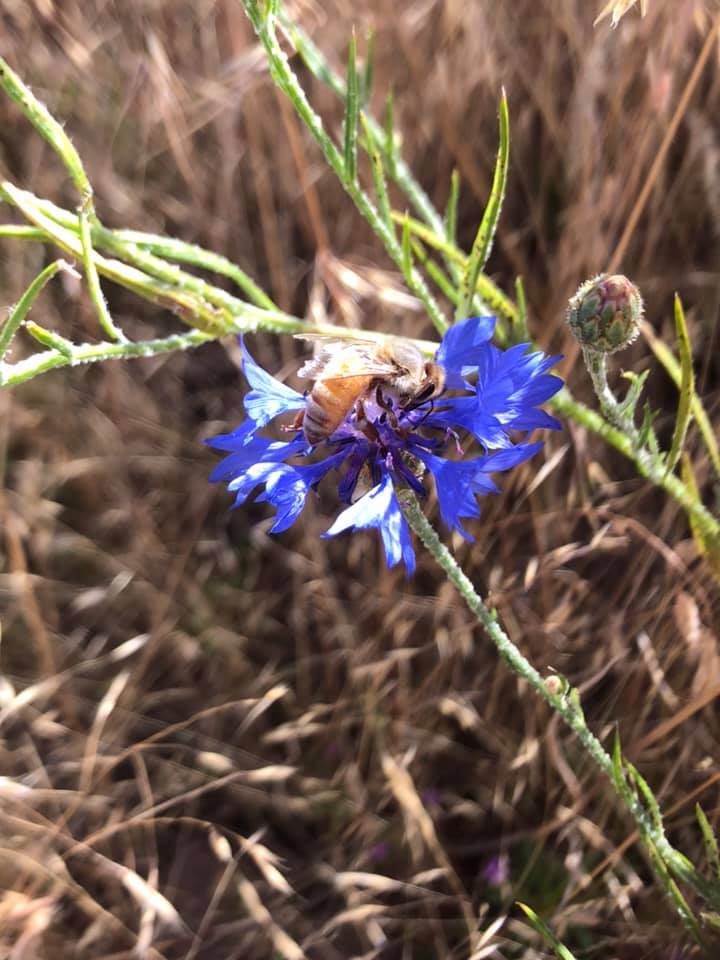 One of a few backyard favorites people put in their gardens this lovely plant comes in many wonderful colors including this stunning blue. Farmers in the area surround their land with this native flower to help feed and attract the pollinators in my area as it is a fairly long lived plant that produces nectar with no effort on their part. This self seeding annual is hardy and can grow almost anywhere making it a choice nectar source in the spring to early summer. Put it in a garden and add water and it can continue blooming till the frost comes! If “bees friend” isn’t blooming yet my bees will utilize this nectar source but once “bees friend” is blooming bachelor button is left to the native bees and wasps.